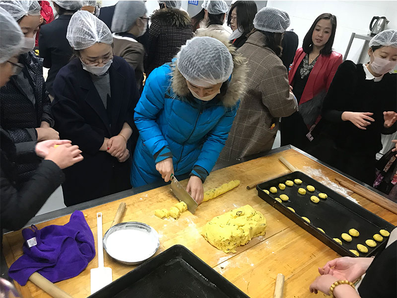 此次活動邀請了玖福團膳餐飲管理有限公司經(jīng)驗豐富的專業(yè)面點師現(xiàn)場授課指導(dǎo)。面點師通過現(xiàn)場制作、演示、介紹,對參加活動的女職工進行指導(dǎo)幫助。大家認真聽講解、做筆記,在面點師的指導(dǎo)下,一起配料、打發(fā)、和面、揉搟、烘焙,興致勃勃,爭相操作實踐,現(xiàn)場一片歡聲笑語。在大家的齊心努力下,奶香四溢的餅干和糖酥餅相繼出爐。大家爭相品嘗著自己的勞動成果,喜笑顏開。